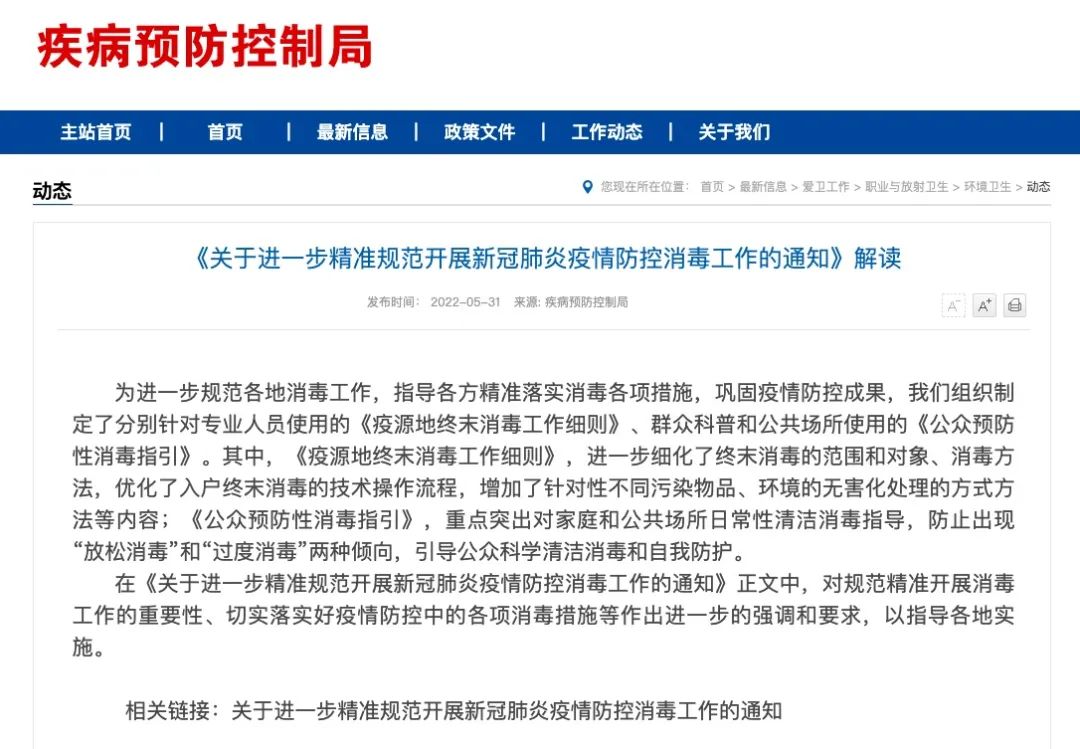 2022 年 5 月 31 日,國家衛健委發布《關于進一步精準規范開展新冠肺炎疫情防控消毒工作的通知》,制定了分別針對專業人員使用的《疫源地終末消毒工作細則》、群眾科普和公共場所使用的《公眾預防性消毒指引》。