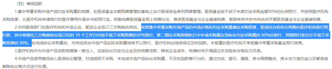 在完成協議采購量后,市州應結合中選產品實際采購量繼續予以預付,醫療機構應繼續保證及時回款。未報量的醫療機構不享受集中帶量采購基金預付政策。