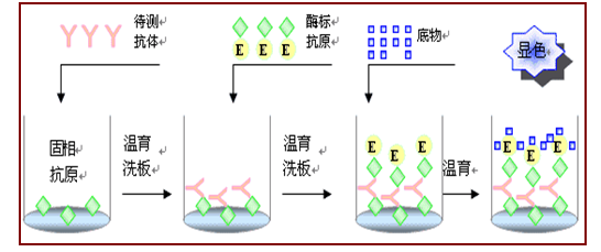 反應(yīng)模式與雙抗體夾心法類似。用特異性抗原進(jìn)行包被和制備酶結(jié)合物,以檢測相應(yīng)的抗體。與間接法測抗體的不同之處為以酶標(biāo)抗原代替酶標(biāo)抗抗體。此法中待測樣本不需稀釋,可直接用于測定,因此其敏感度相對高于間接法。本法關(guān)鍵在于酶標(biāo)抗原的制備,應(yīng)根據(jù)抗原結(jié)構(gòu)的不同,尋找合適的標(biāo)記方法。