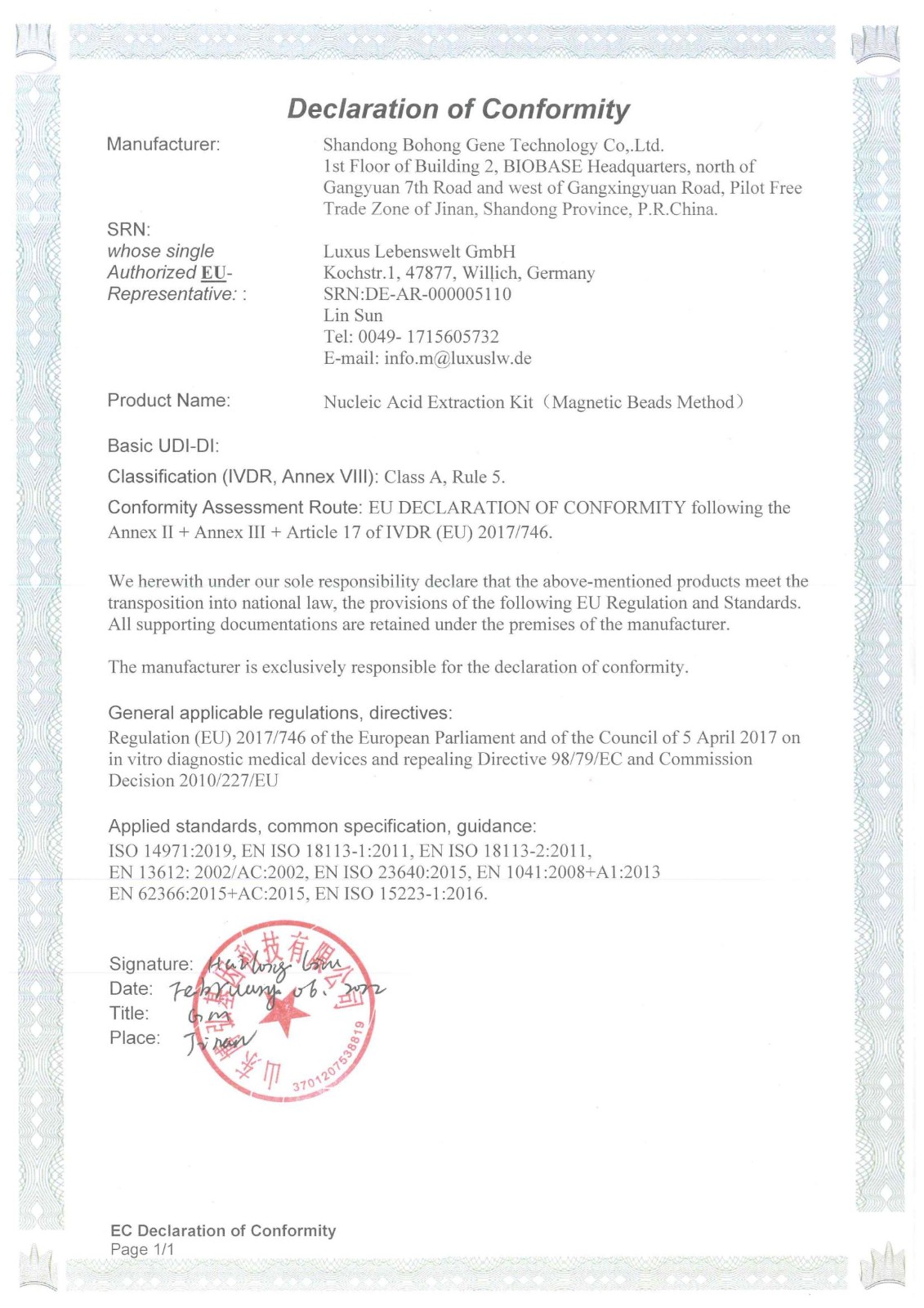 【更多】熱烈祝賀山東博弘基因科技有限公司核酸提取試劑盒、核酸提取儀和一次性使用病毒采樣管取得CE認證!