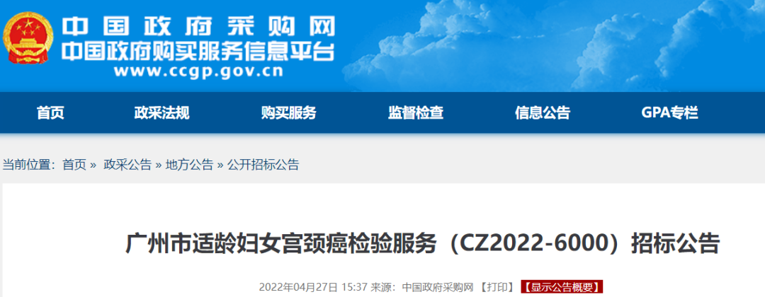 4月27日,中國政府采購網發布《廣州市適齡婦女宮頸癌檢驗服務(CZ2022-6000)招標公告》。項目說明及總體要求廣州市婦女兒童醫療中心受廣州市衛生健康委員會委托,進行本次“廣州市適齡婦女宮頸癌檢驗服務”招標。由越秀、海珠、荔灣、天河、白云、番禺、花都、南沙、黃埔、增…
